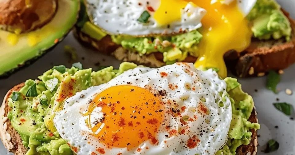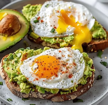 Avocado toast with eggs: Toast some whole-grain bread, mash avocado on top, add an egg, and sprinkle salt and pepper.